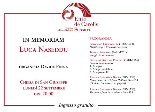 In memoria di Luca Naseddu, Chiesa di San Giuseppe Lunedì 22 settembre ore 20 Organista Davide Pinna Il 22 settembre alle ore 20.00 nella chiesa di San Giuseppe l'Ente de Carolis...